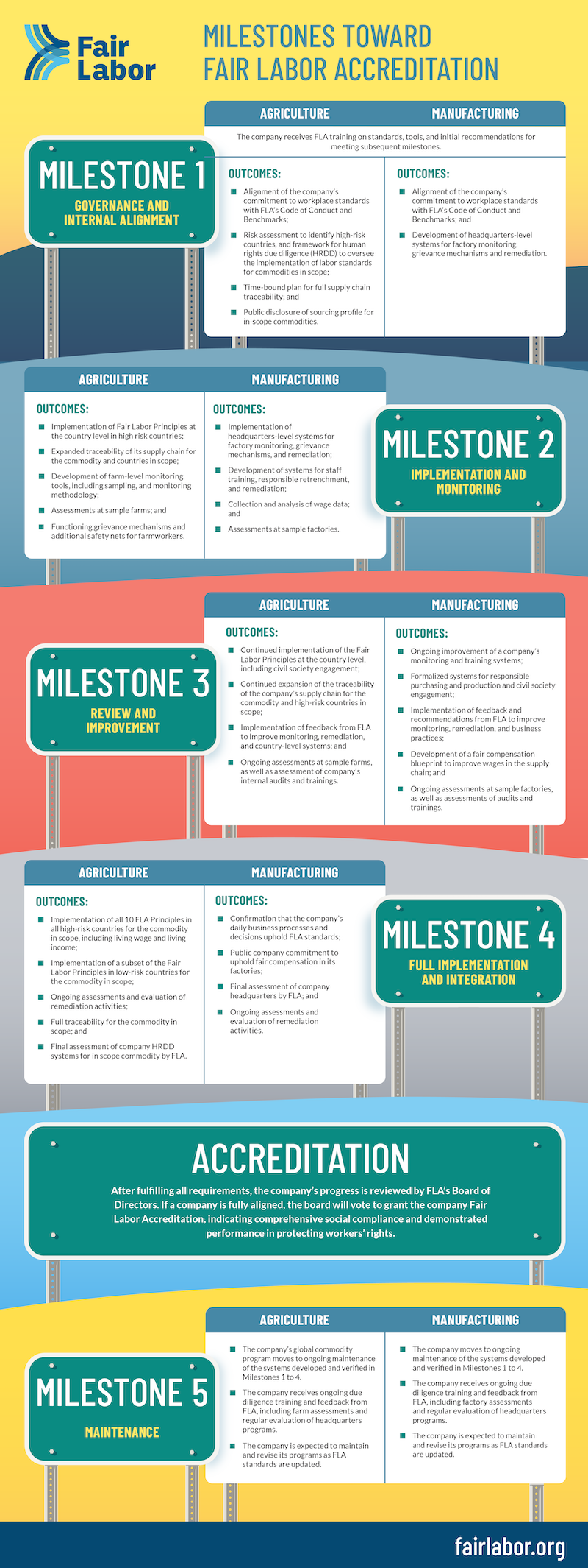 Fair Labor Accreditation is a rigorous, multi-year process that evaluates a company’s systems to improve labor conditions in its farms or factories based on five milestones. Each milestone represents key building blocks of an effective social compliance program that improves working conditions and worker well-being, ranging from a high-level commitment to fair labor practices to implementation of monitoring processes, grievance mechanisms, and remediation systems. Once a company meets all milestones and is accredited by the FLA Board of Directors, it must continuously work to maintain alignment with FLA’s standards.